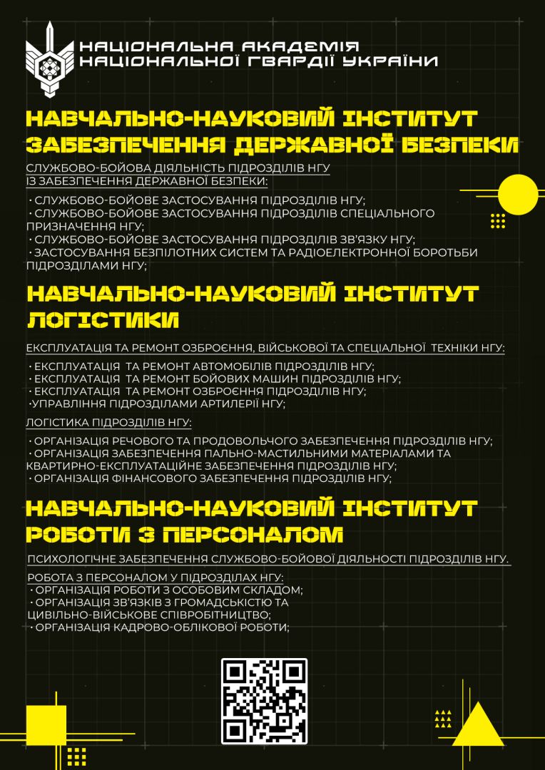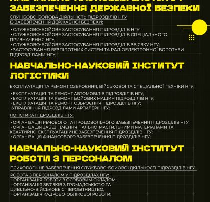 Популяризація військової освіти, участь у підготовці висококваліфікованих професійних офіцерських кадрів для Національної гвардії України та інших військових формувань, а також створення умов для соціальної адаптації ветеранів в рамках реалізації ветеранської політики в Україні.